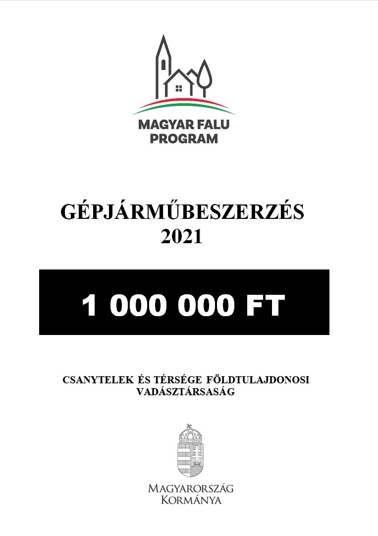 FCA-KP-1-2021/2-001551Pályázati felhívás megnevezése: „Csanytelek és Térsége Földtulajdonosi Vadásztársaság gépjárműbeszerzése a Magyar Falu Program Falusi Civil Alap keretében” |
